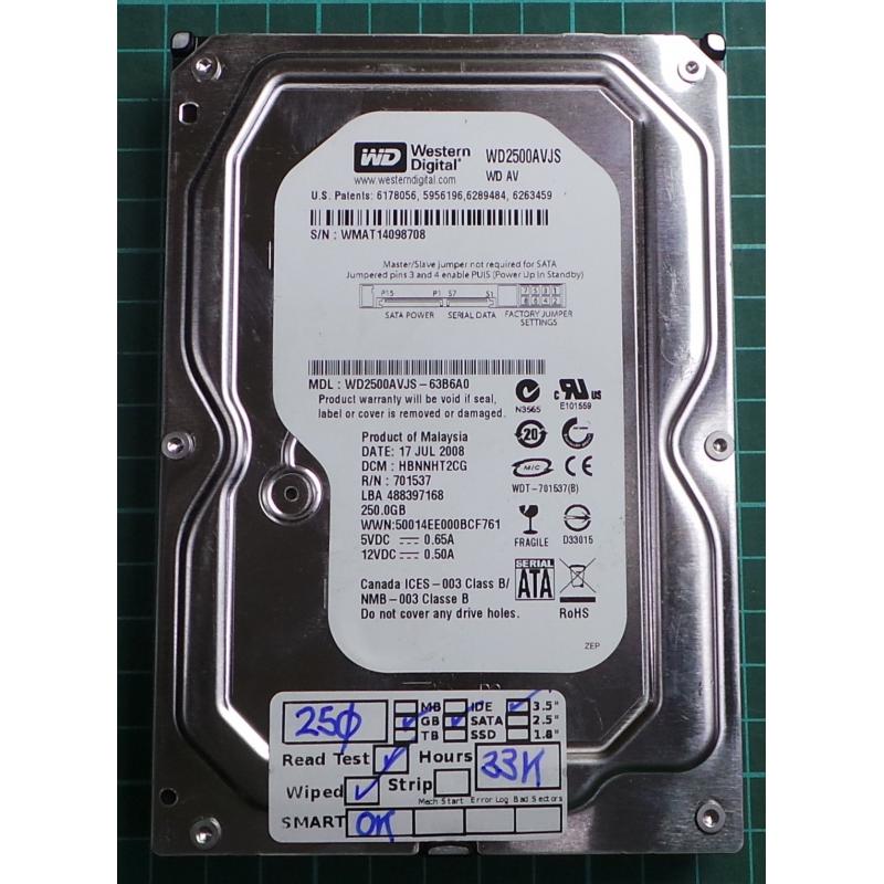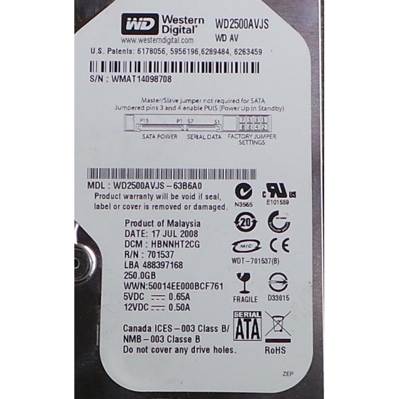 USED, Hard Disk, WD2500AVJS, WD AV, WD2500AVJS-63B6A0, Desktop, SATA, 250GB