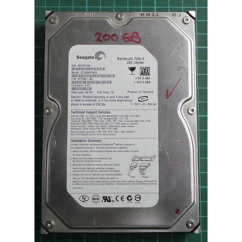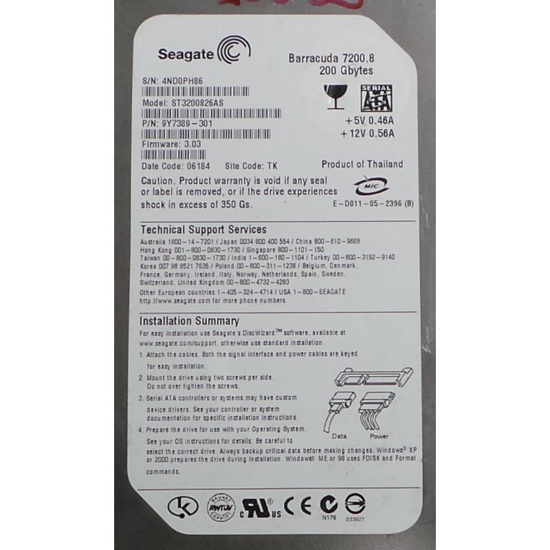 USED, Hard Disk, Barracuda 7200.8, ST3200826AS, Seagate, P/N: 9Y7389-301, Firmware: 3.03, Desktop, SATA, 200GB
