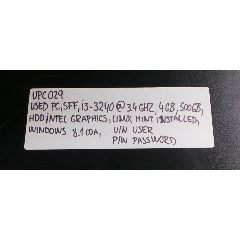 USED PC, SFF, i3-3240@3.4GHZ,4GB,500GB,HDD, intel graphics,Linux mint installed,windows 8.1 coa, U/N: user, P/W: password